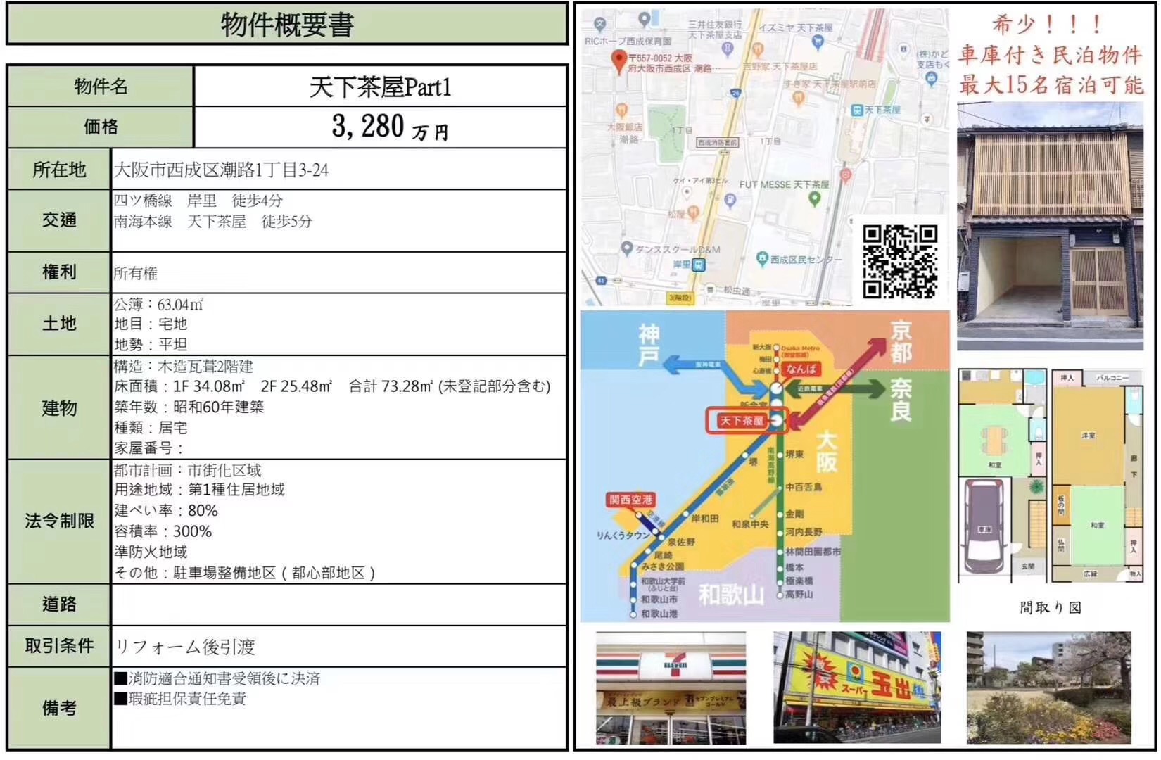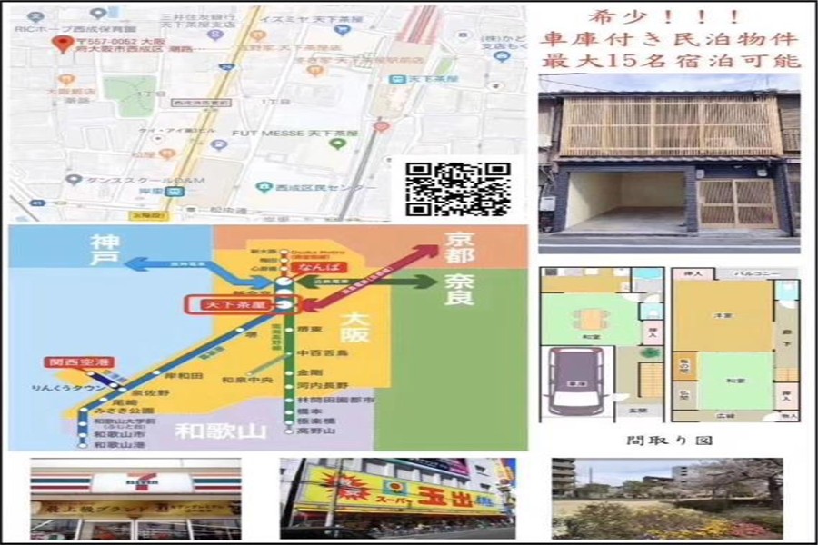 大阪市西成区茶屋,1985年建木制二层建筑。带车库的民宿房屋,可入住15人。距车站近,是稀缺房源。
