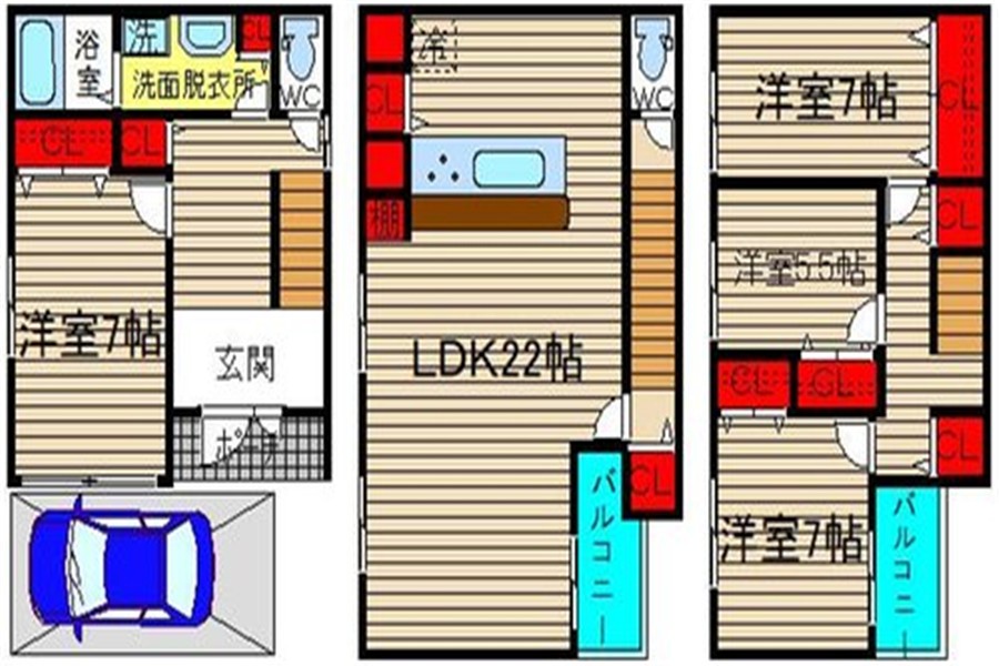 浪速区大国3一户建,2012年建成木制三层建筑。JR大阪环状线“今宫”步100米。高屋顶车库。