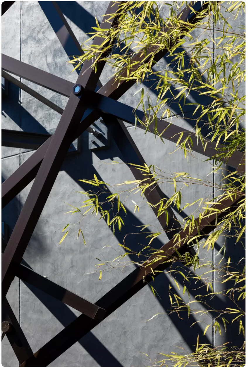 建筑外观无疑是它最显著的特色。由一个巨大的格栅屏障包围着两幢建筑,将其与街道分离开来。形成巧妙统一的连续感。这样的设计独立于街道形成一个内部通道,让建筑与城市的距离更退一步。纵横交错的格栅,加之摇曳的竹叶,在建筑灰色外墙上创造出梦幻的光影效果。