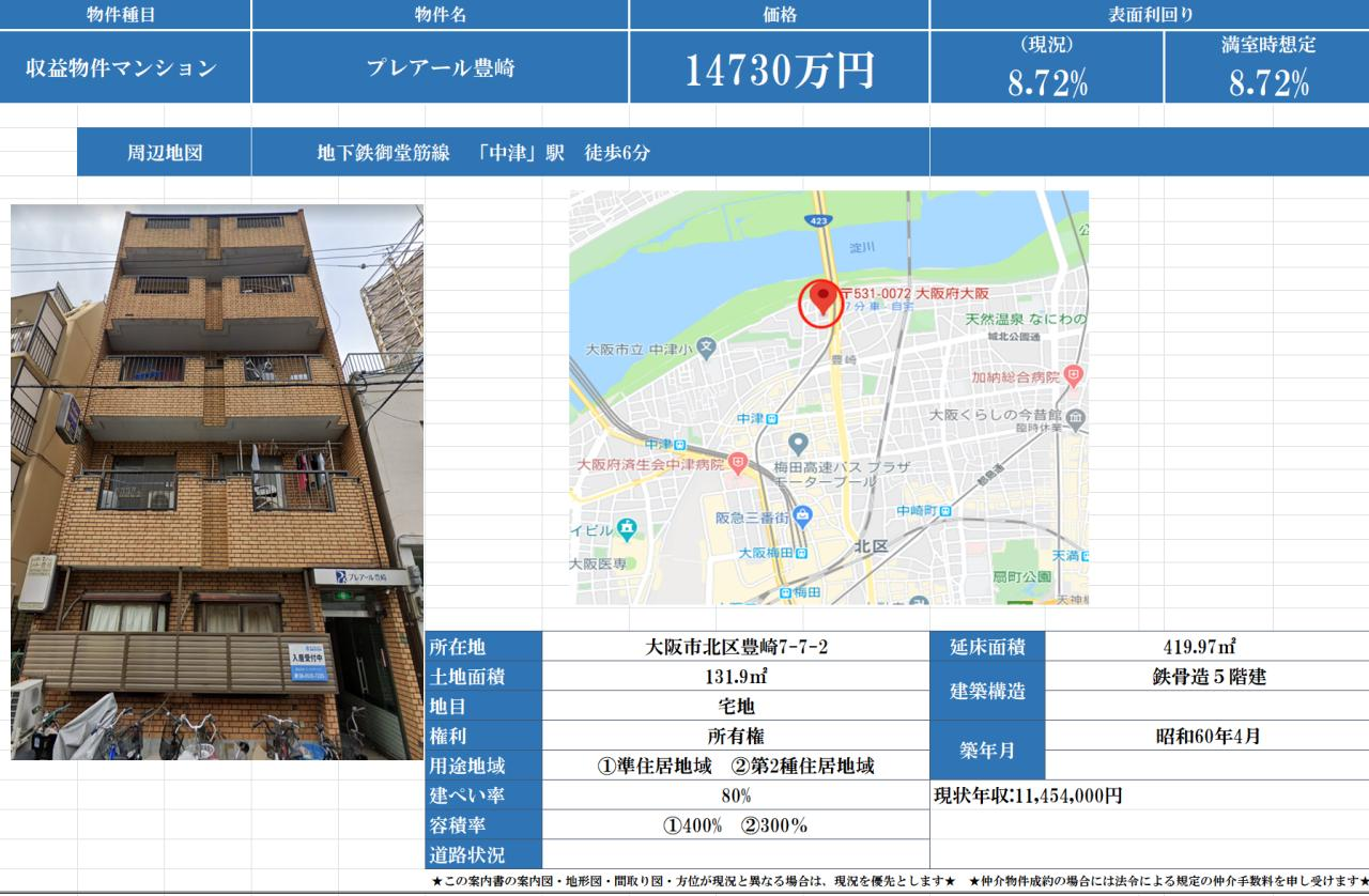 公寓位大阪市北区豊崎,到中津站需6分钟,在通勤通学上非常便利。正因为有这样的优势,租赁需求较高,可以期待较稳定的投资。公寓附近超市、公园、饮食店等徒步10分钟以内均可到达,生活方便。